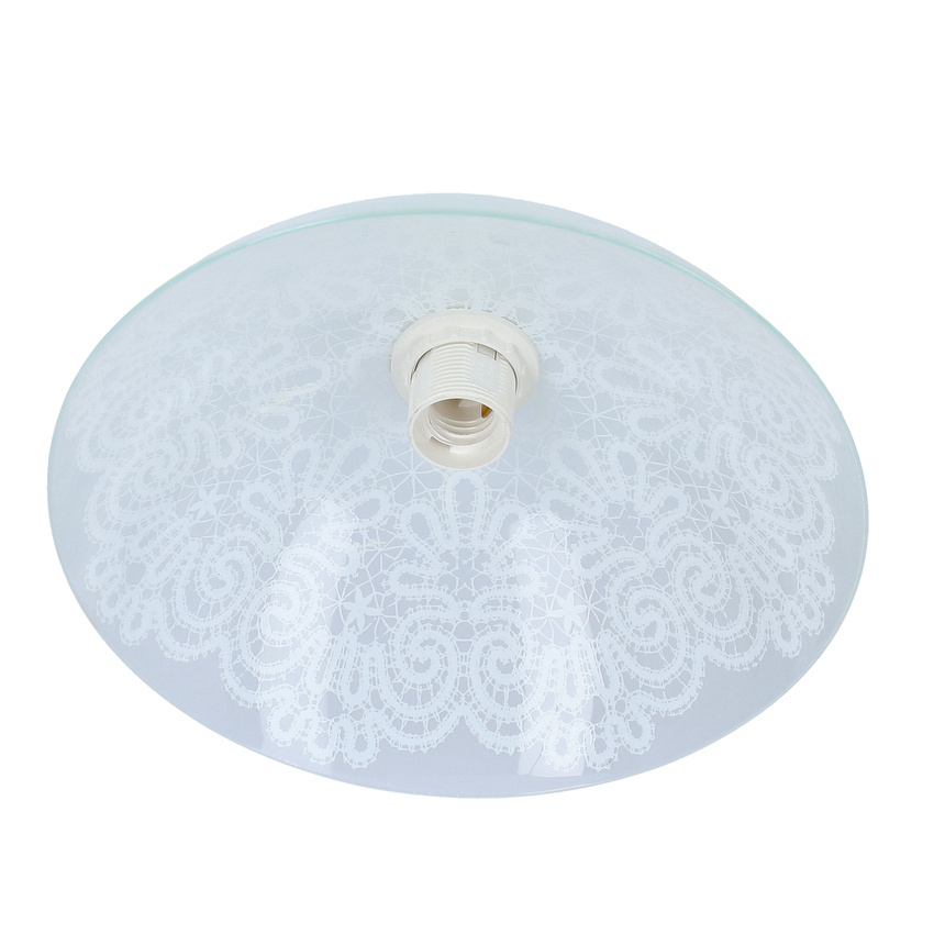 Ein Lampenschirm aus gebogenem Glas, vollständig verziert mit einem originellen Spitzenmuster, das im Produktionsprozess durch Sandstrahlen, Polieren und Lackieren entsteht. Matt von außen. Aufgehängt an einem Kunststoffseil.